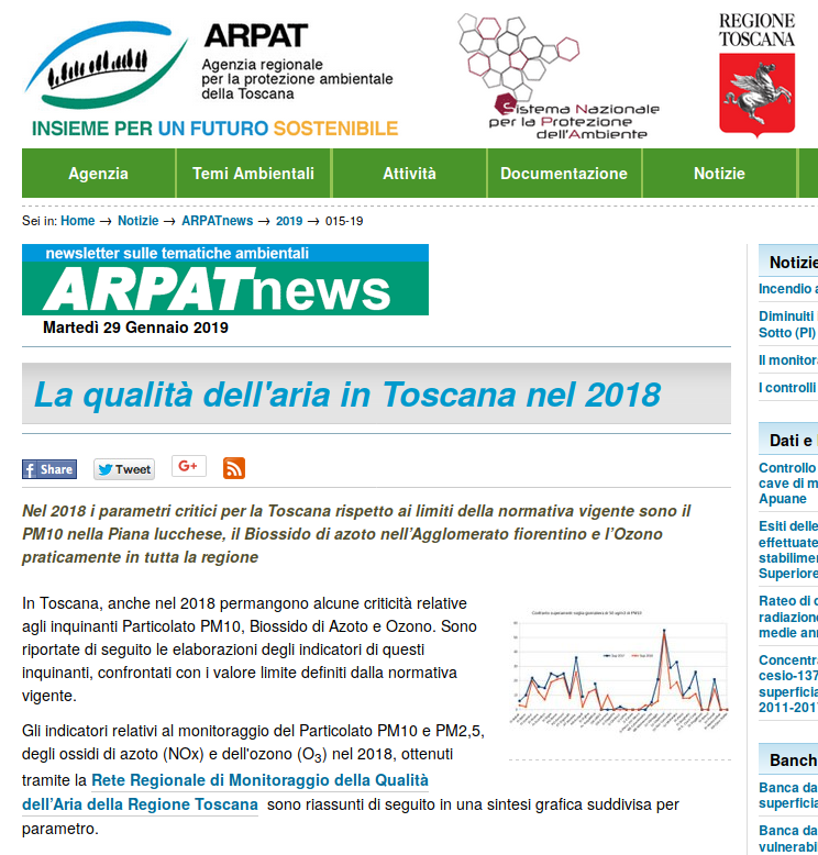 In attesa che nel corso dei prossimi mesi venga pubblicata la relazione annuale relativa allo stato dell’inquinamento atmosferico nel 2018, da ARPAT hanno elaborato un primo focus che mostra una situazione in miglioramento per la qualità dell’aria sul territorio regionale, anche se «permangono alcune criticità relative agli inquinanti particolato Pm10, biossido di azoto e ozono», soprattutto in alcune aree della Rete regionale di monitoraggio della qualità dell’aria della Regione Toscana.
