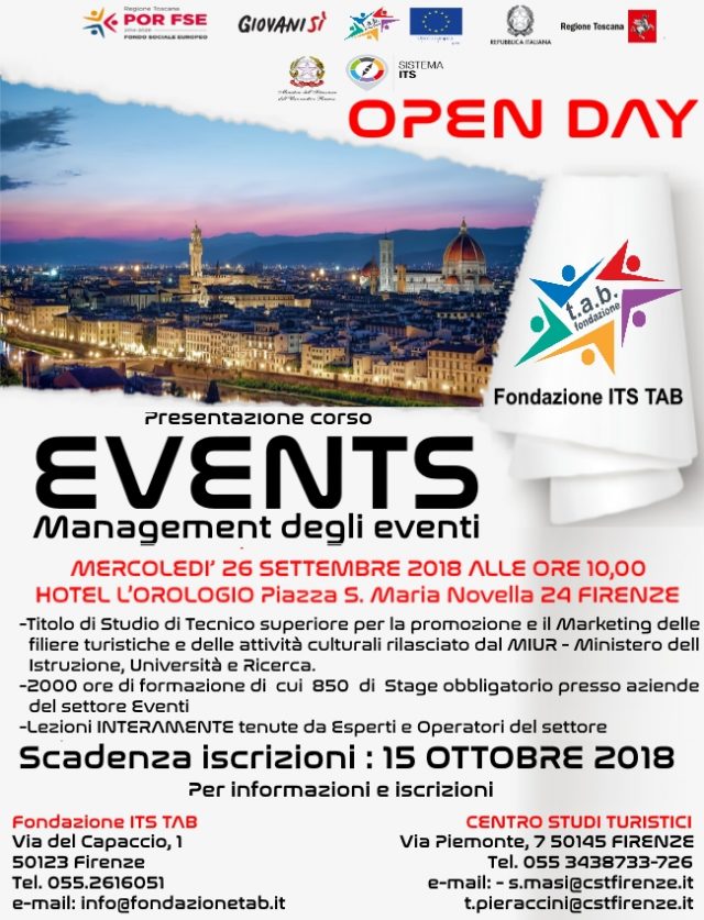 Il 26 settembre a Firenze si terrà una giornata informativa sul corso Tecnico superiore per la comunicazione e il marketing delle filiere turistiche e delle attività culturali – progetto EVENTS”, organizzato dalla Fondazione Istituto Tecnico Superiore Turismo, Arte e Beni Culturali (ITS TAB), in cui verranno illustrate le opportunità offerte dal corso e sarà possibile parlare con docenti e responsabili per capire il percorso di studi e gli sbocchi occupazionali.