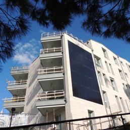 La residenza Le Pietre Rosa è un edificio di pregio, con certificazione di classe energetica A+ che, con un concentrato di tecnologia applicata, garantisce ai suoi otto appartamenti su cinque piani (per 1.200 metri quadrati) sia riscaldamento invernale che acqua calda sanitaria. La tecnologia geotermica è realizzata con nove sonde che, alla profondità di 150 metri, sfruttano la temperatura costante del sottosuolo sia d’estate che d’inverno, estraendo calore dal sottosuolo nei mesi invernali e cedendolo in quelli estivi; il fotovoltaico è costituito da 25 pannelli con moduli di silicio monocristallino, integrati nella facciata Sud. La parete ventilata è formata da blocchi rivestiti a cappotto da uno strato isolante, da una camera d’aria debolmente ventilata e da un paramento in marmo rosa, da cui il complesso prende il nome. L’edificio non ha alcuna caldaia, né camini: sia per il riscaldamento invernale che per il raffrescamento estivo non vengono utilizzati combustibili. E perfino le cucine sono smart, con piastre a induzione. Partito nel 2010, il progetto, realizzato dall’impresa Gadolla spa, è arrivato a conclusione a dicembre del 2013. Finora sono due gli appartamenti venduti e un terzo è in fase di vendita.