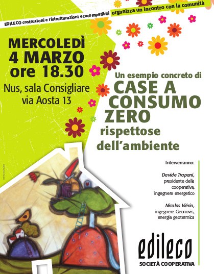Delle case a consumo zero se ne parlerà a Nus mercoledì 4 marzo, alle ore ore 18,30 nella sala del Consiglio Comunale, per iniziatica della cooperativa Edileco, presidente l’ingegner Davide Trapani, che con l’ingegnere Geonovis Nicolas Vierin, esperto di geotermia. "Il cuore del sistema – spiega l’ingegnere – è una pompa di calore, cioè una macchina elettrica, banalmente paragonabile ad un frigorifero, che noi tutti abbiamo già in casa. L’energia del sole, invece, viene trasformata in energia elettrica dai pannelli fotovoltaici e poi usata per alimentare la pompa di calore".