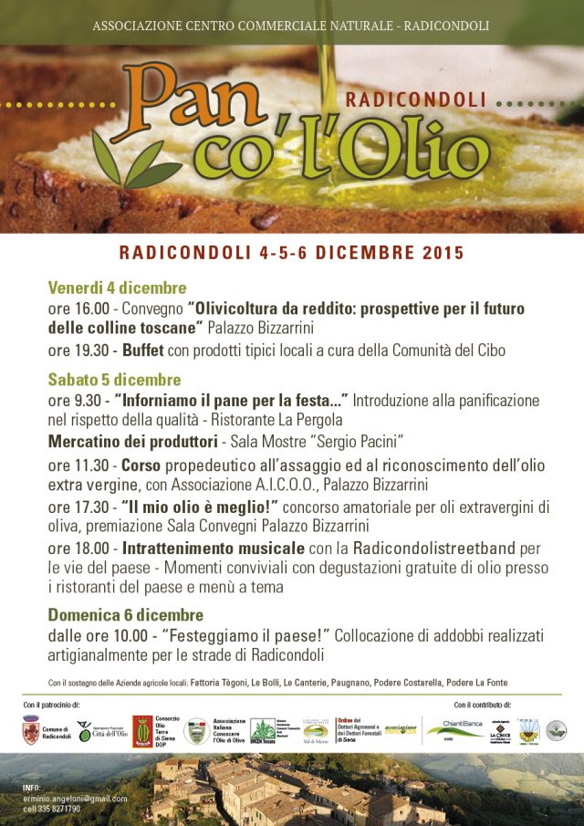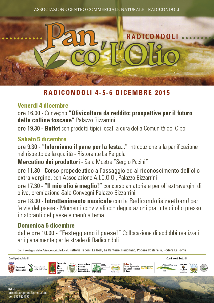 Nell’ambito dell’evento "Pan co’l’Olio" organizzata a cura dell’Associazione Centro Commerciale Naturale di Radicondoli, è previsto un ricco carnet di attività destinate a coinvolgere -oltre alla cittadinanza- anche una platea "tecnica", con il convegno sul tema "Olivicoltura da reddito: prospettive per il futuro delle colline toscane".