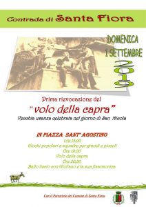La Contrada di Santa Fiora, con il patrocinio del Comune, organizza la prima rievocazione del volo della capra, in programma domenica 1 settembre, a partire dalle ore 15, in piazza Sant’Agostino.Il volo della capra era un rituale di buon augurio, di origine pagana, che risale alla notte dei tempi e che è stato praticato a Santa Fiora fino a un centinaio di anni fa, il giorno di San Nicola ovvero l’11 settembre, a ridosso del raccolto delle castagne.