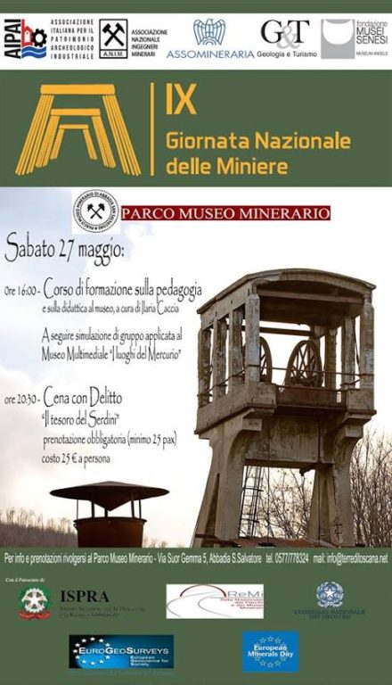 In occasione della IX^ Edizione Della Giornata delle Miniere, promossa dalle associazioni AIPAI, ANIM, ASSOMINERARIA, G&T- Geologia e Turismo, sotto il patrocinio di ISPRA, ReMi e del Consiglio Nazionale dei Geologi, il Parco Museo Minerario, in collaborazione con i ragazzi del sevizio civile – Museum Angels promosso da Fondazione Musei Senesi, presenta la sua prima Cena con Delitto. Durante la cena i partecipanti si troveranno ad indagare su un misfatto che vede come protagonisti i pionieri della nostra miniera. Una serata all’insegna del divertimento e del buon cibo.