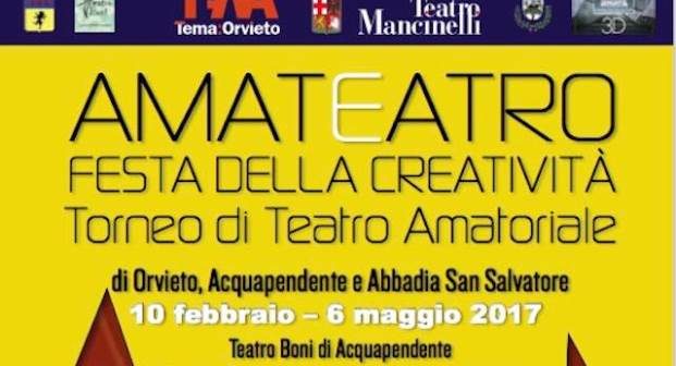 Parte la quinta edizione di “Amateatro, Festa della Creatività” promossa dall’associazione Te.Ma. di Orvieto che vedrà, come gli anni passati, i teatri “Boni” di Acquapendente, “Amiata” di Abbadia San Salvatore e il “Mancinelli” di Orvieto, palcoscenici del Torneo Amatoriale che vedrà in gara ben 10 compagnie di diverse regioni.