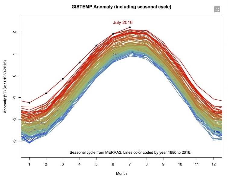 È stato così caldo che Gavin Schmidt, direttore del Goddard institute of space studies della Nasa, ha twittato: «Luglio 2016 è stato in assoluto il mese più caldo da quando sono cominciate le registrazioni strumentali». E ha allegato il grafico che pubblichiamo di fianco. La Nasa ha calcolato che luglio 2016 è stato di 0.84° C più caldo rispetto alla media globale 1950-1980 e Schmidt ha detto che è stato circa 0,18 gradi Fahrenheit più caldo rispetto ai precedenti record registrati nel luglio 2011 e nel luglio 2015.