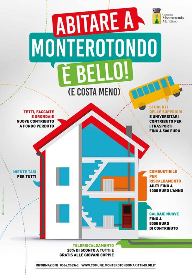 Incentivi, contributi e sgravi fiscali rendono Monterotondo Marittimo uno dei territori più attrattivi per mettere su casa. La Giunta comunale, con lo slogan “Abitare a Monterontondo è bello e costa meno”, presenta un insieme di misure interessanti per il salvadanaio delle famiglie: a partire dalla scelta di non applicare la Tasi (tassa sui servizi indivisibili) a nessuna tipologia di immobile.