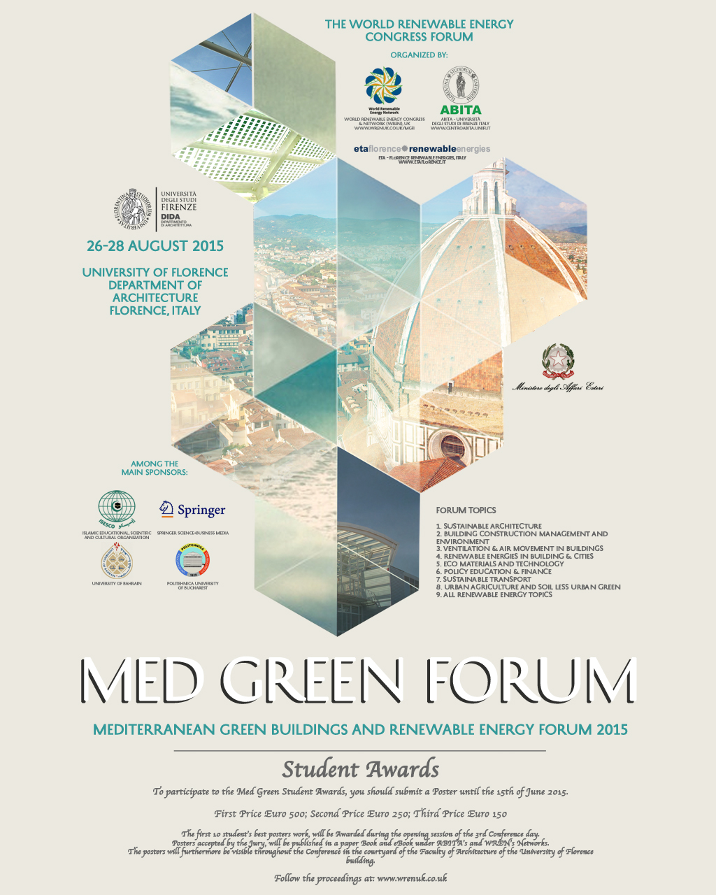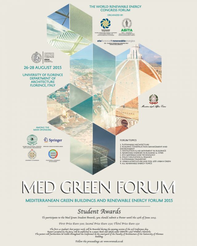 L’appuntamento fiorentino, che ha ricevuto il patrocinio del Ministero degli Affari Esteri e del Ministero per lo Sviluppo Economico è organizzato dal World Renewable Energy Congress e da Abita (Centro Interuniversitario di Architettura Bioecologica e Innovazione Tecnologica per l’Ambiente). La segreteria è affidata a ETA Florence. Il Forum sarà ospitato presso la sede della Facoltà di Architettura dell’Ateneo fiorentino (Campus Santa Verdiana, Piazza Ghiberti, 27). Nell’ambito dell’iniziativa saranno anche erogati i Med Green Student Awards rivolti ai migliori 10 poster su progetti di ricerca.