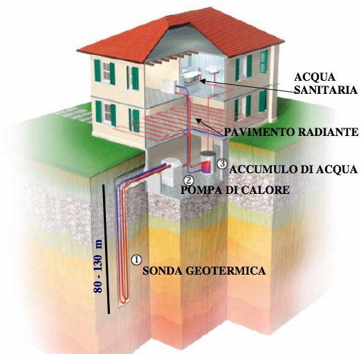 Le pompe di calore accoppiate al terreno, denominate pompe di calore geotermiche, sono sistemi che permettono il trasferimento di energia termica dal terreno all’edificio (in regime di riscaldamento) o dall’edificio al terreno (in regime di raffrescamento).