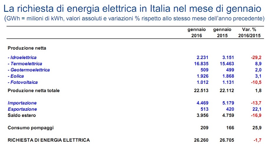 Continua il calo della produzione da idroelettrico, anche in maniera preoccupante: appena 2,2 TWh a gennaio, con un decremento del 29,2% sul gennaio 2015 e di oltre il 46%rispetto al gennaio 2014 (4,2 TWh), quasi la metà. Nel mese scorso le rinnovabili si attestano su una produzione di circa 7,3 TWh, con il fotovoltaico che perde il 10,5% sullo stesso mese dell’anno precedente (circa 1 TWh generato). Questi alcuni dati elaborati in base al rapporto mensile di Terna (pdf).