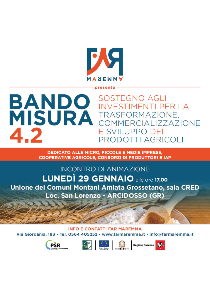 Lunedi 29 gennaio p.v. alle ore 17.00 presso l’Unione dei Comuni Montani Amiata Grossetana, sala Cred, incontro per la presentazione del bando sulla Misura 4.2 del GAL Far Maremma uscito sul BURT n. 3 parte III dello scorso 17 gennaio…(continua)