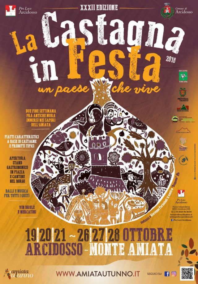 “La Castagna in Festa” torna ad Arcidosso dove per due fine settimana si celebra il frutto a cui si sono legate le sorti di tante donne e uomini dell’Amiata. Una festa fatta dalla gente: sono tante le associazioni di volontariato del territorio che collaborano alla buona riuscita, allestendo stand con prodotti a base di castagne e birra di castagne. Sono aperte anche le cantine nel centro storico mentre un ricco programma di spettacoli e concerti anima il paese dove si svolgono originali mercatini dell’artigianato e antiquariato…(continua)