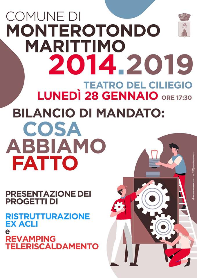 LUNEDÌ 28 GENNAIO ore 17:30 Teatro del Ciliegio di Monterotondo Marittimo Bilancio di Mandato: Cosa abbiamo fatto e presentazione della Ristrutturazione Ex Acli e del Revamping del Teleriscaldamento