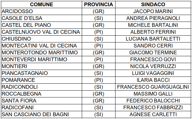 L'elenco degli Amministratori dei Comuni soci di Co.SviG. SCRL e firmatari dell'Accordo Generale sulla Geotermia dopo le ultime Elezioni Amministrative.