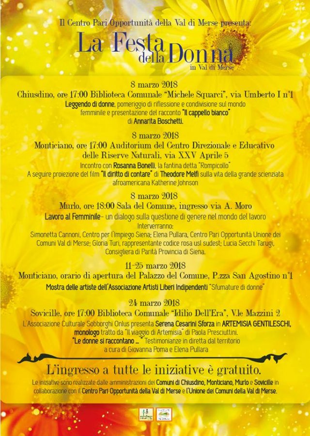 Cartellone di eventi e iniziative del Centro Pari Opportunità della Val di Cpo Val Di Merse che tocca temi centrali e valorizza l’impegno sociale, civile e culturale delle donne del nostro territorio: il lavoro, vera cartina di tornasole dello status sociale ed economico delle donne nel nostro paese; la violenza contro le donne; la lotta delle donne per affermarsi in ambiti storicamente maschili, quali lo sport e la scienza…. e tanto altro.