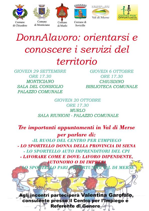 Giovedì 6 ottobre 2016, alle ore 17:30 presso la Biblioteca Comunale "Michele Squarci" di Chiusdino, si terrà l’incontro "DonnAlavoro: orientarsi e conoscere i servizi del territorio". All’incontro parteciperanno Valentina Garofalo, consulente presso il Centro per l’Impiego di Siena e Referente di Genere, e Elena Pullara, operatrice del Centro Pari Opportunità Val di Merse.