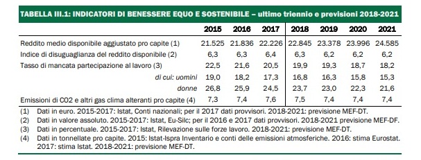 Per i prossimi anni il quadro tendenziale (a legislazione vigente) mostra un Pil nazionale che "in via prudenziale" viene stimato in crescita dell’1,5% nel 2018 e dell’1,4% nel 2019, con un rapporto deficit/Pil che prosegue il cammino di discesa collocandosi all’1,6% nel 2018 e allo 0,8% nel 2019, per raggiungere il pareggio nel 2020. Anche il rapporto debito/Pil è previsto in calo al 130,8% nel 2018, al 128% nel 2019, al 124,7 nel 2020. Com’è evidente, non si tratta però di dati sufficienti a mostrare se e come migliorerà il benessere dei cittadini italiani, oltre che dei conti pubblici.