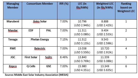Le sei offerte presentate per il parco fotovoltaico di Abu Dhabi, sono state tutte fortemente competitive e, nonostante i prezzi bassi, tutti i partecipanti alla gara hanno previsto un Tasso Interno di Rendimento (IRR per dirlo con l’acronimo inglese) del 7% o più, a dimostrazione della sostenibilità finanziaria del progetto.