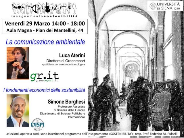 L’economista ambientale Simone Borghesi e il nostro direttore Luca Aterini protagonisti oggi del corso universitario aperto a tutti i cittadini, e promosso dal gruppo di Ecodinamica dell’Ateneo. L’appuntamento dalle 14 alle 18, al Complesso didattico di Pian dei Mantellini