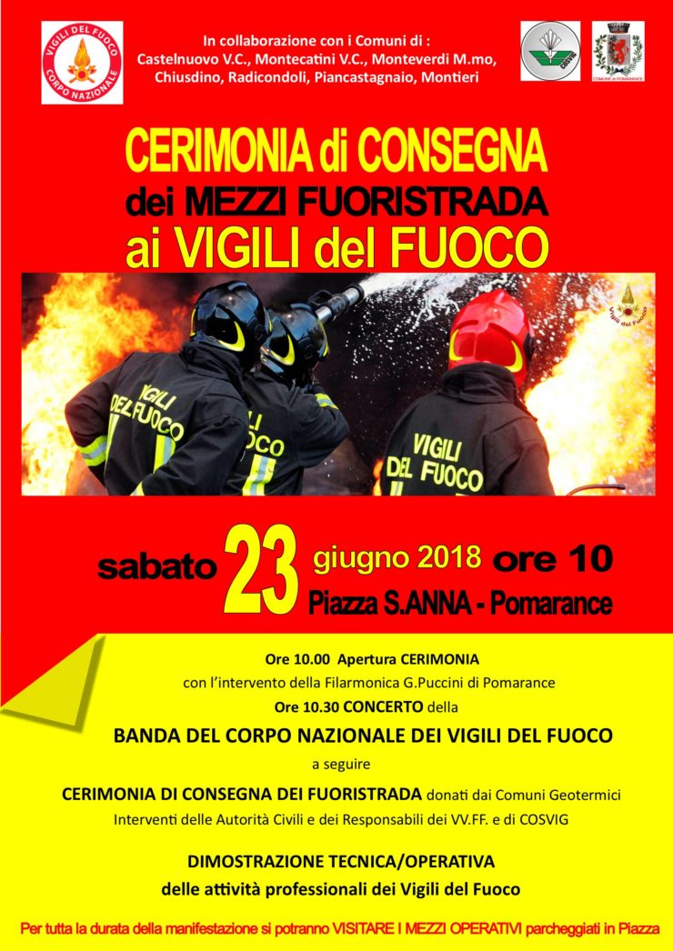 Sabato 23 Giugno, a Pomarance, verranno consegnati ai Vigi li del Fuoco di Siena e Pisa (Distaccamento di Saline di Volterra) due mezzi antincendio acquistati da CoSviG – per conto dei Comuni di Castelnuovo Val di Cecina, Chiusdino, Montecatini Val di Cecina, Montieri, Piancastagnaio, Pomarance e Radicondoli – con le risorse del Fondo Geotermico. Un concreto contributo alla lotta contro la piaga degli incendi boschivi che ogni anno affligge la nostra Regione.