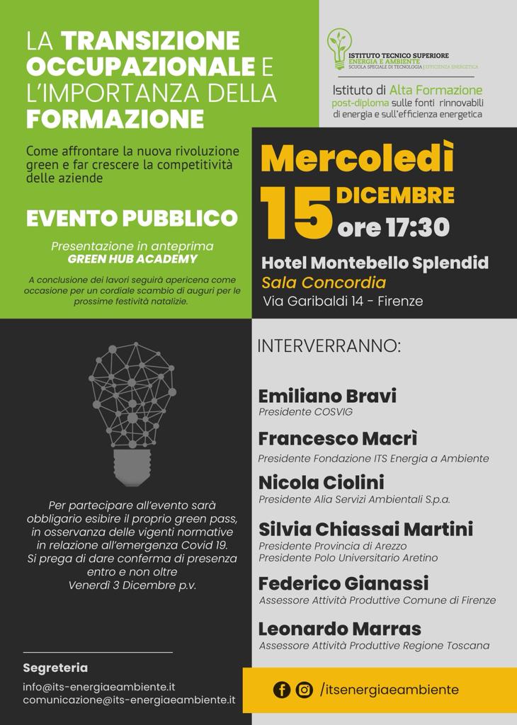 L’evento si terrà a Firenze, mercoledì 15 dicembre a partire dalle 17.30, nella sala Concordia dell’Hotel Montebello Splendid (via Garibaldi, 14): oltre a Emiliano Bravi (CoSviG) parteciperanno Francesco Macrì (presidente Fondazione ITS Energia e Ambiente), Nicola Ciolini (presidente ALIA Servizi Ambientali spa), Silvia Chiassai Martini (presidente Provincia di Arezzo e Polo Universitario Aretino), Federico Giannassi (assessore alle Attività produttive del Comune di Firenze) e Leonardo Marras (assessore alle Attività Produttive della Regione Toscana).