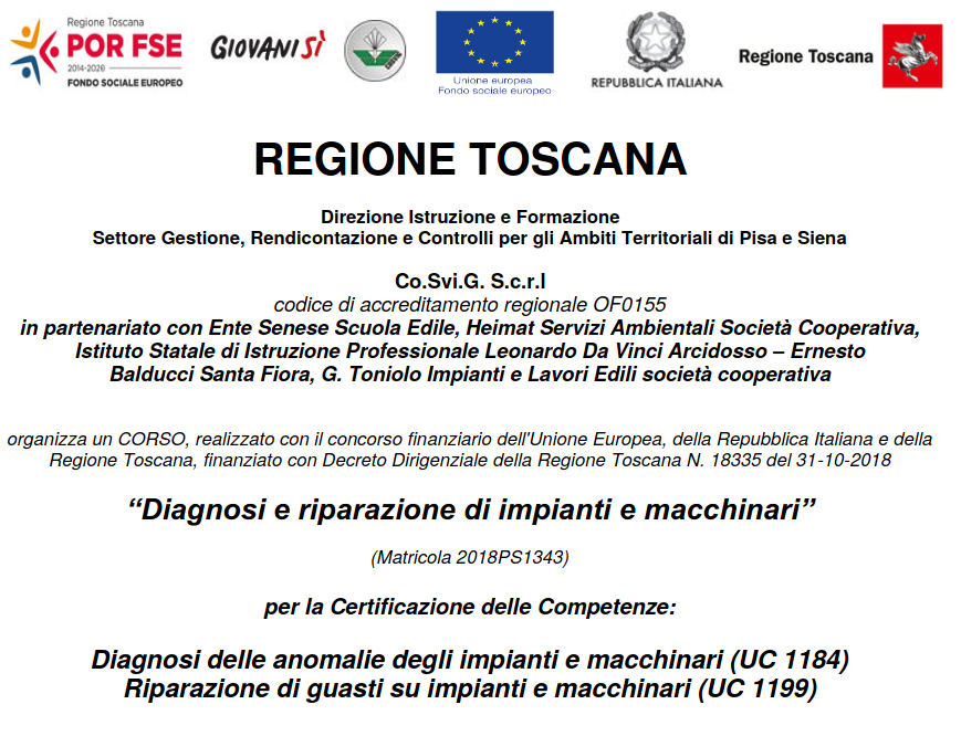 REGIONE TOSCANA, Direzione Istruzione e Formazione Settore Gestione, Rendicontazione e Controlli per gli Ambiti Territoriali di Pisa e Siena, Co.Svi.G. S.c.r.l, codice di accreditamento regionale OF0155 in partenariato con Ente Senese Scuola Edile, Heimat Servizi Ambientali Società Cooperativa, Istituto Statale di Istruzione Professionale Leonardo Da Vinci Arcidosso –Ernesto Balducci Santa Fiora, G. Toniolo Impianti e Lavori Edili società cooperativa organizza un CORSO,realizzato con il concorso finanziario dell’Unione Europea, della Repubblica Italiana e della Regione Toscana, finanziato con Decreto Dirigenziale della Regione Toscana N. 18335 del 31-10-2018 “Diagnosi e riparazione di impianti e macchinari” (Matricola 2018PS1343) per la Certificazione delle Competenze: Diagnosi delle anomalie degli impianti e macchinari (UC 1184) Riparazione di guasti su impianti e macchinari (UC 1199)nell’ambito del progetto:T.RI.M.M.ER. -Tecnico delle operazioni di RIparazione e manutenzione di Macchinari e impianti Meccanici ed ElettRici(codice 236831).