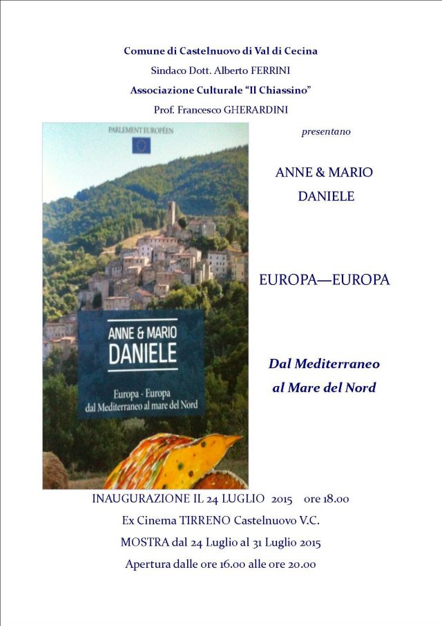 Venerdì 24 luglio alle ore 18.00  si aprirà la Mostra dei lavori di Anne e Mario Daniele nella sala a piano terra dell’ex Cinema Tirreno ; si tratta di una Mostra che è già stata ospitata nell’ Espace Altiero Spinelli del Parlamento europeo a Bruxelles, nella Galleria Rosai a Firenze e recentemente nei giorni scorsi a Bruges. La mostra si protrarrà fino al 31 Luglio.