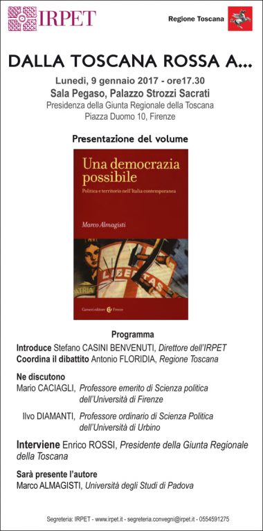 L’incontro si svolgerà lunedì 9 gennaio in Sala Pegaso, Palazzo Strozzi Sacrati, (Piazza Duomo 10, Firenze), alle 17.30. Il dibattito sarà introdotto da Stefano Casini Benvenuti direttore Irpet e coordinato da Antonio Floridia di Regione Toscana.