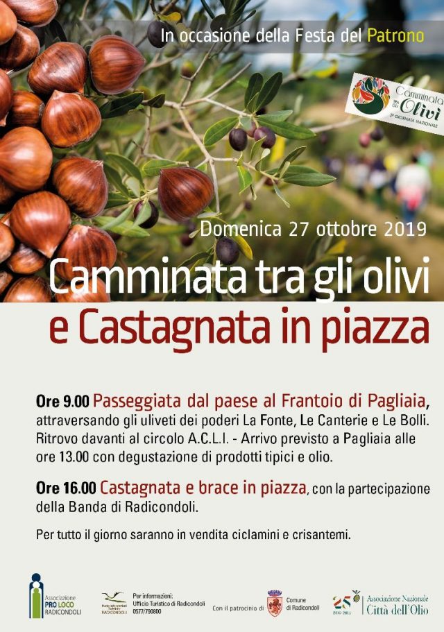 Una domenica passata all’insegna della spensieratezza, tra una passeggiata in mezzo agli ulivi e una castagnata in piazza, accompagnata da brace, vino e altri prodotti tipici. E’ quella in programma per il prossimo fine settimana, il 27 ottobre, a Radicondolicontinua