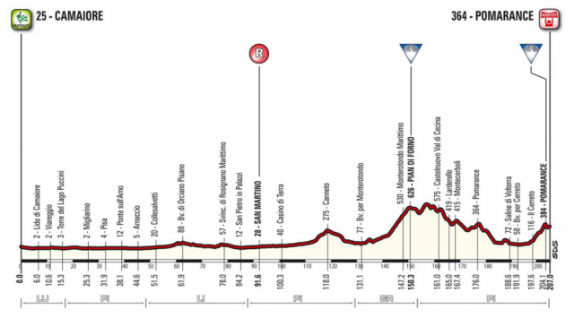 Una Tirreno-Adriatico con tanta Toscana: Si comincia mercoledì 9 marzo con una cronosquadre di 22.7 km a Lido di Camaiore (Lucca). Poi ci sarà la prima frazione in linea, giovedì 10, da Camaiore a Pomarance (Pisa), 207 km con pochissima pianura e il primo arrivo in salita. Per finire il terzo giorno, venerdì 11, ci sarà la partenza di tappa da Castelnuovo Val di Cecina (Pisa).