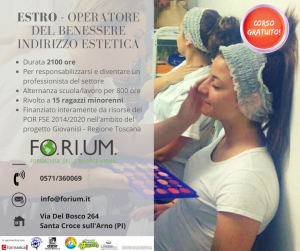 ‘Estro’ è il corso per operatori del benessere con indirizzo estetica destinato a 15 ragazzi ed è organizzato da Forium in parnership con Formatica Srl, Copernico Scarl, Cescot Toscana Nord, L’Itc ‘Carlo Cattaneo’ di San Miniato, Ulisse srl, Centro Studi Estetica e Hashtag Formazione Benessere. Le lezioni in entrambi i casi si terranno nella sede di Forium di via del Bosco 264/F a Santa Croce sull’Arno…(continua)