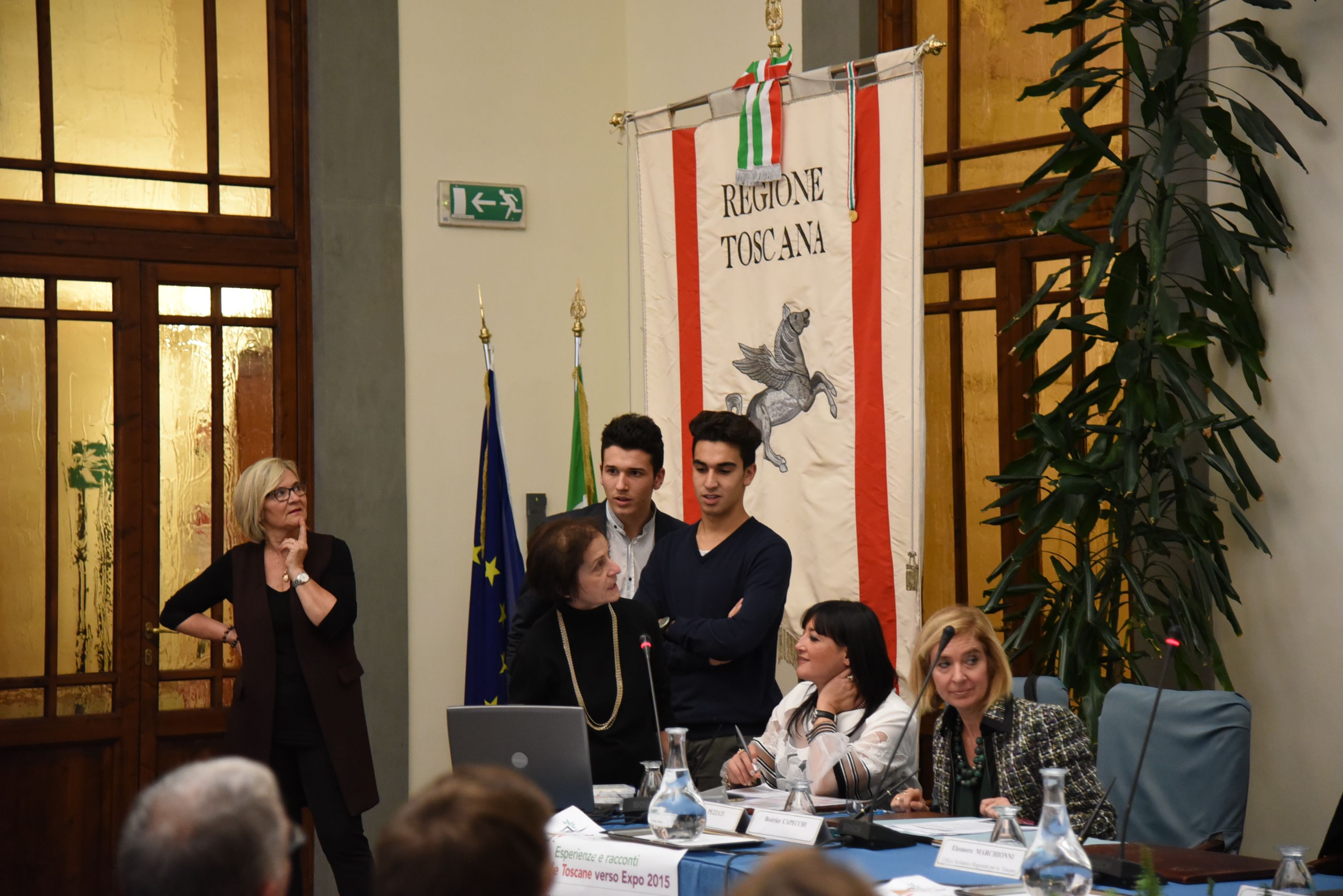 La sala Pegaso, la cornice di rappresentanza della Regione Toscana è strapiena: ci sono allievi e insegnanti di 33 scuole di tutta la Toscana, di tutte le età, che hanno lavorato sui temi di Expo 2015 grazie ad un’iniziativa realizzata dalla Regione insieme alla all’Ufficio scolastico regionale e alle scuole stesse. Sono qui per raccontare il loro lavoro, quello che li ha impegnati a riscoprire il territorio, la cultura, la storia, il cibo, ma anche la coltivazione di un orto con prodotti tipici toscani. "Esperienze e racconti – le scuole toscane verso Expo":il titolo dell’iniziativa che ha visto i ragazzi, a due a due, in rappresentanza delle varie scuole, spiegare il tema del loro lavoro e quello che ha significato per loro l’esperiemnza di Expo.