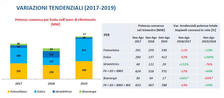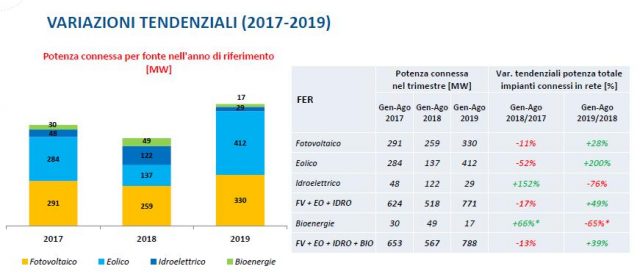 Nel periodo gennaio-agosto 2019 le nuove installazioni di rinnovabili nel nostro paese hanno raggiunto i 771MW, cioè il 39% in più rispetto al 2018.