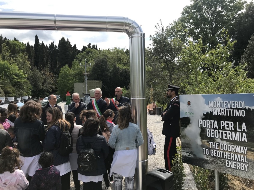 È stato infatti inaugurato questa mattina a Monteverdi, sulla SP 329 al km 19+800, il Parco “Porta per la Geotermia” che appena prima del paese di Monteverdi, lato Sassetta, illustra la geotermia toscana attraverso pannelli che in italiano e in inglese spiegano la storia e il funzionamento di questa risorsa rinnovabile, abbinandoli ad altre pannellature sui luoghi turistici da visitare sul territorio, nonché tramite una bella esposizione di componentistica del ciclo produttivo geotermico, dai vapordotti che costituiscono anche la porta di accesso al parco fino ai boccapozzi, alla torre di raffreddamento e ad altre apparecchiature che consentono al vapore proveniente dal cuore della terra di arrivare in turbina per la produzione di energia elettrica per poi essere utilizzato a fini termici per il teleriscaldamento di case e aziende nonché per altri usi plurimi e innovativi.