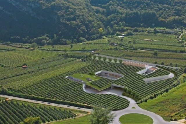 Ubicata nel territorio della Vallagarina, la Cantina Mori Colli Zugna, entrata in funzione nel 2010, è stata progettata con criteri tecnologicamente avanzati e nel rispetto dell’ambiente. L’opera si mimetizza tra i terrazzamenti coltivati a vite delle prealpi trentine: dei 100.000 m3 soltanto 1500 emergono dalla terra, visibili ma inseriti in armonia nel contesto agricolo. Il grosso della nuova struttura è infatti totalmente incassato in terra, il vigneto è stato reimpiantato su gran parte della copertura della cantina interrata e il tetto-giardino è stato utilizzato per il volume degli uffici.  La superficie interessata è di circa 6.500 m2, con una profondità media di 15 metri. Il volume interrato corrisponde invece a circa 100.000 m3.