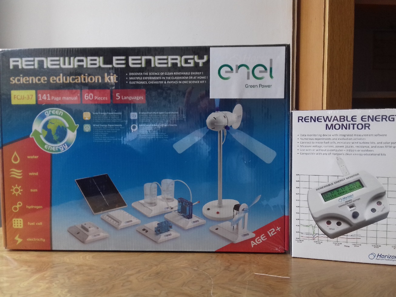 Il kit comprende una piccola turbina eolica, un mini pannello solare fotovoltaico, un piccolo elettrolizzatore funzionante, una micro fuel cells PEM e un monitor multifunzione che può essere collegato ad un pc per creare visualizzazioni grafiche più approfondite dei dati registrati durante l’esperimento: questo permetterà un approccio visivo dei risultati, facilitando molto l’apprendimento. Inoltre, per aumentare il coinvolgimento dell’intero gruppo di sperimentatori, si potrà collegare il PC a schermi di grandi dimensioni o proiettare sulle pareti, cosicché i risultati potranno essere visti in tempo reale da tutta la classe.
