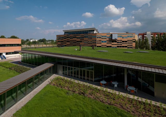 Per quanto riguarda invece l’approvvigionamento energetico è direttamente Frigerio Design Group a spiegarne le caratteristiche: «Il complesso è alimentato da un impianto geotermico di 800 KW e da un impianto fotovoltaico di 428 KW», rendendo così il calore rinnovabile che arriva dalle profondità del pianeta la principale fonte di energia per il vasto headquarter bancario.