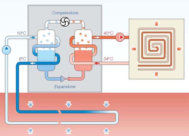 Le pompe di calore sono delle macchine in grado di estrarre calore da sorgenti che si trovano a temperatura più bassa e trasferirlo a una sorgente a temperatura più alta e viceversa. Le pompe di calore sono alimentate a energia elettrica ed hanno un COP di 3÷4 ovvero per ogni kWh di energia elettrica consumata la pompa ne fornisce 3÷4 kWh di calore termico. L’impianto geotermico lavorando a certe temperature impone all’interno dell’unità abitativa un sistema di distribuzione del calore a bassa temperatura, come per esempio i pannelli radianti a pavimento (collegamento) o bocchette di ventilazione. Un sistema tipo radiante avendo una temperatura di mandata di circa 30-36°C richiede un impianto di potenza inferiore rispetto al tradizionale impianto con termosifoni e non necessita di alcun allacciamento alla rete del gas e di alcuna canna fumaria.