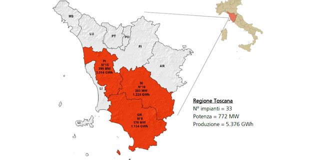 La Toscana ha un record invidiabile: il 26% del fabbisogno energetico è coperto dalla produzione di elettricità attraverso lo sfruttamento del fenomeno geotermico, insomma dal vapore, fonte rinnovabile per eccellenza. I dati di produzione relativi all’anno 2011 dicono che Enel Green Power, nei 33 impianti geotermici dislocati tra le province di Pisa, Grosseto e Siena, ha prodotto 5.300 GWh battendo il precedente record di 5.232 GWh che risaliva al 2007. La produzione di energia elettrica da fonte rinnovabile, assicurata dalle centrali geotermiche toscane ha permesso di soddisfare nel 2011 il 26% del fabbisogno energetico regionale i cui consumi globali sono stati di 19.870 GWh: si tratta di un ulteriore record, considerato che finora la percentuale massima si era attestata al 25%. A Larderello e in Toscana Enel Green Power gestisce il più antico complesso geotermico del mondo e detiene il know how della geotermia che esporta in tutto il pianeta. Delle 33 centrali geotermoelettriche di Enel Green Power, 15 sono in provincia di Pisa per un totale di 16 gruppi di produzione; 10 sono nella provincia di Siena per 11 complessivi gruppi di produzione; infine, 8 si trovano nella provincia di Grosseto. La potenza installata complessiva è di 874,5 MW. I 5 miliardi e 300 milioni di KWh prodotti in Toscana corrispondono al consumo medio annuo di oltre due milioni di famiglie e forniscono calore utile a riscaldare circa 9.000 utenze nonchè 25 ettari di serre, caseifici e ad alimentare una importante filiera gastronomica e turistica.