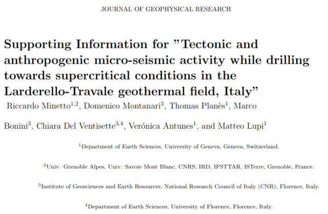 Insieme a un team di ricercatori dell’Università di Ginevra, dell’Università di Firenze e del CNR, il geofisico Matteo Lupi ha condotto lo studio Tectonic and Anthropogenic Microseismic Activity While Drilling Toward Supercritical Conditions in the Larderello‐Travale Geothermal Field, Italy: una ricerca di cui abbiamo già parlato su queste pagine – sviluppata contestualmente al progetto europeo Descramble condotto a Larderello – documentando come neanche la perforazione di un pozzo geotermico profondo (sono stati raccolti dati fino a 2,9 km nel sottosuolo) in condizioni di temperatura e pressione particolarmente sfidanti abbia causato «attività sismica incontrollata», mostrando il grado di maturità ormai raggiunto dalle tecnologie geotermiche.