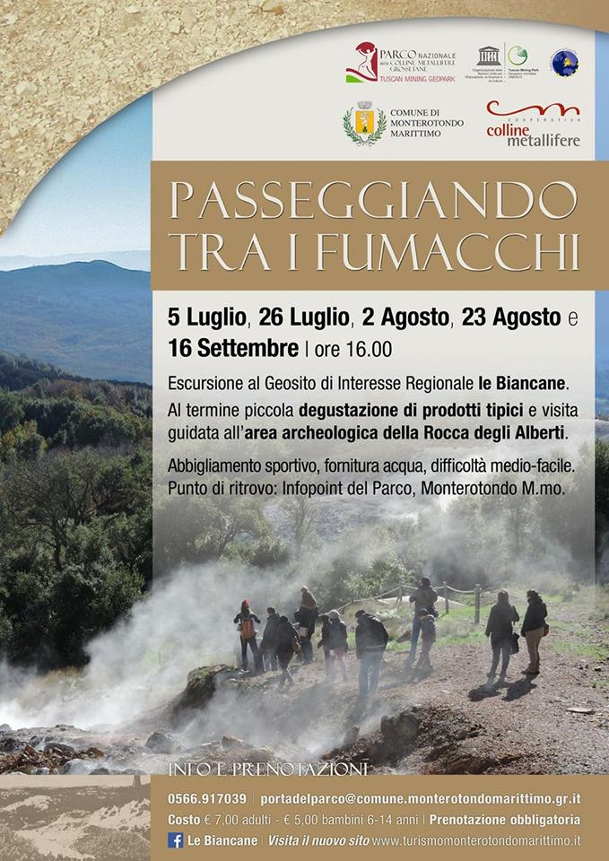 Per chi volesse partecipare a una o più escursioni previste nel ciclo “Passeggiando tra i fumacchi” – per le quali si raccomanda un abbigliamento sportivo e comodo –, il Comune di Monterotondo Marittimo informa che il costo è di 7 euro per gli adulti e 5 per i bambini dai 6 ai 14 anni; la prenotazione è obbligatoria, con il ritrovo previsto all’info point del Parco delle Biancane.