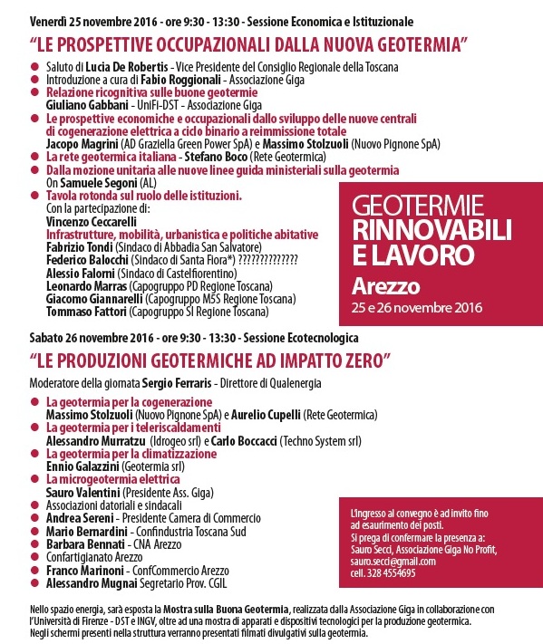 Nasce un distretto toscano delle nuove tecnologie geotermiche ad impatto zero, che ha la possibilità di diventare leader mondiale del mercato dell’energia rinnovabile geotermica, oggi ad ogni livello considerata la più stabile, continua ed efficiente fonte rinnovabile disponibile. A differenza di quanto avvenuto per lo sviluppo di altre energie rinnovabili, l’Italia diviene centro dei nuovi processi geotermici ma anche centro della produzione delle macchine ed apparati per fare produzione geotermia. Il Convegno descriverà le grandi prospettive occupazionali che questo scenario comporta e cercherà di costruire le alleanze necessarie per rimuovere resistenze burocratiche, conservatorismi annientalisti, intralci politici che nel loro complesso stanno determinando, non solo un gravissimo danno alla lotta contro i cambiamenti climatici ma rischiano di soffocare sul nascere una delle più grandi prospettive di rinascita dell’economia toscana e italiana.
