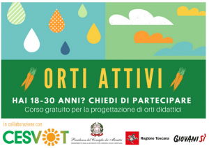 Sono aperte le iscrizioni al corso di formazione gratuito rivolto a 30 giovani tra i 18 e i 30 anni “Realizzare un orto didattico” realizzato nell’ambito del progetto “Orti Attivi”, progetto realizzato a valere sul Bando Volontariato per la Comunità del Cesvot finanziato con il contributo di Regione Toscana Giovanisì in accordo con il Dipartimento della Gioventù e del Servizio Civile Nazionale.