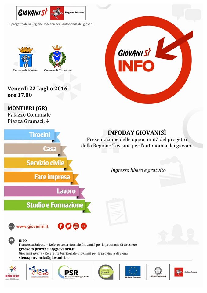 Si terrà a Montieri (con il patrocinio del Comune di Montieri e del Comune di Chiusdino) il 22 Luglio p.v. alle ore 17.00 preesso il Palazzo Comunale in Via Gramsci 4, l’Infoday GiovaniSì, incontro di presentazione delle opportunità del progetto della Regione Toscana per l’autonomia dei giovani.