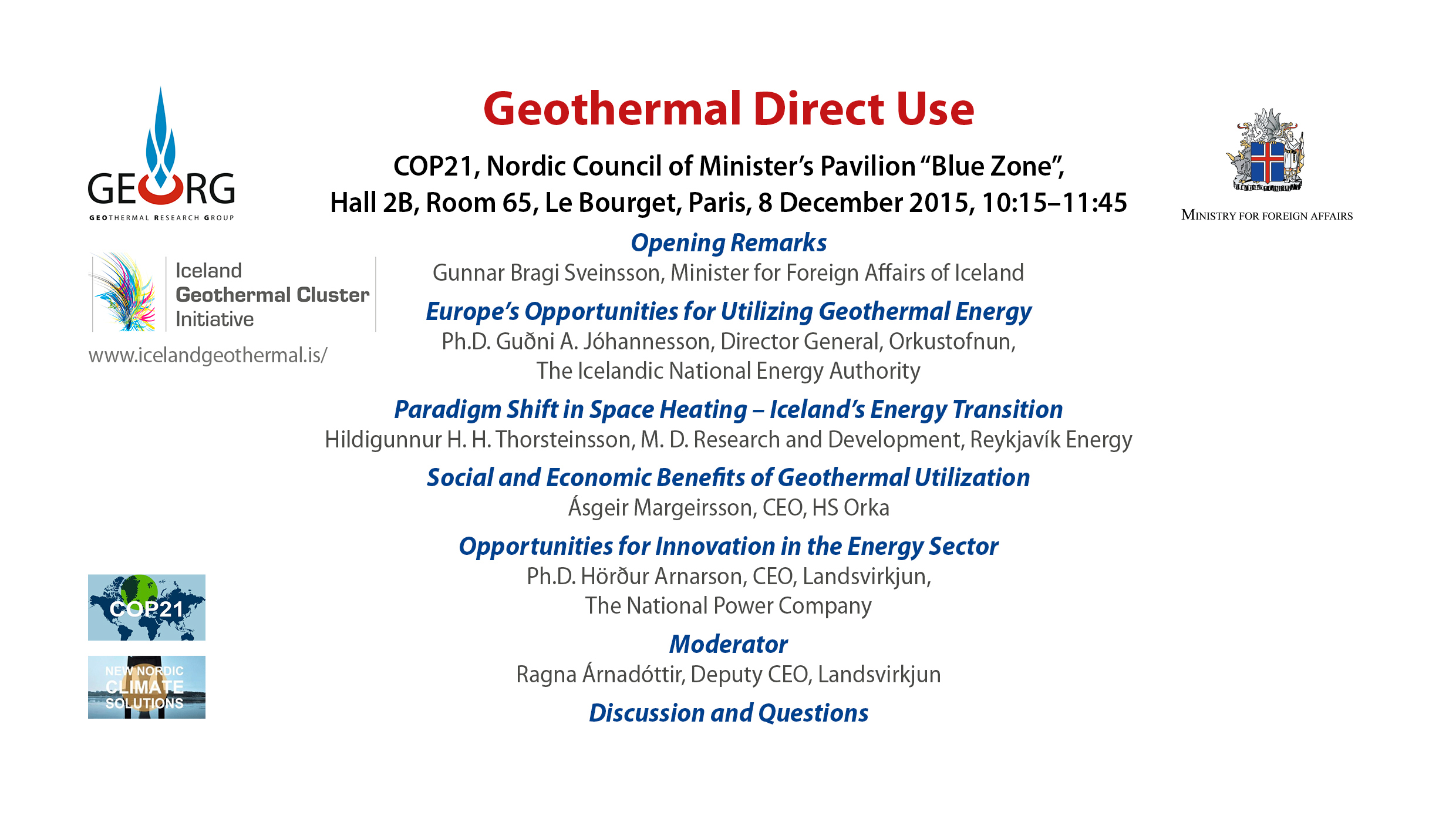 Iceland Geothermal organizzerà l’8 Dicembre una sessione del COP21 sul tema“Usi Diretti della Geotermia” in collaborazione con il Ministero degli Esteri islandese e GEORG (GEOthermal Research Group).