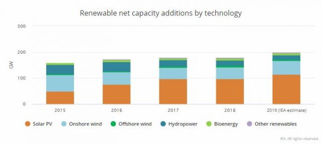 Secondo l'Agenzia Internazionale per l'Energia, nel 2019, dopo lo stallo dello scorso anno, saranno installati 200 GW di nuova capacità rinnovabile, grazie soprattutto a eolico e fotovoltaico