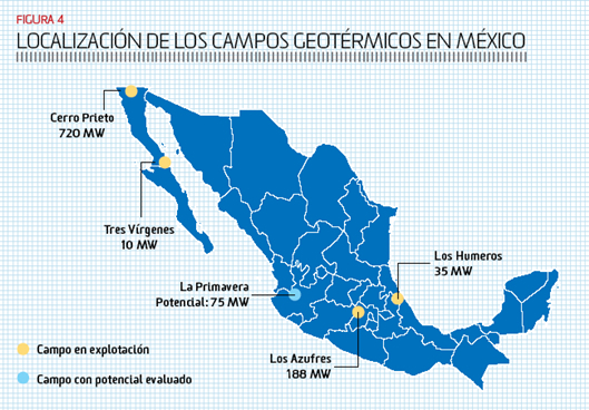 Finora la CFE ha sviluppato e gestito quattro campi geotermici nel paese: Cerro Prieto, Bassa California; Il Azufres in Michoacan; I Camini, a Puebla, e Las Tres Virgenes, Baja California Sur.