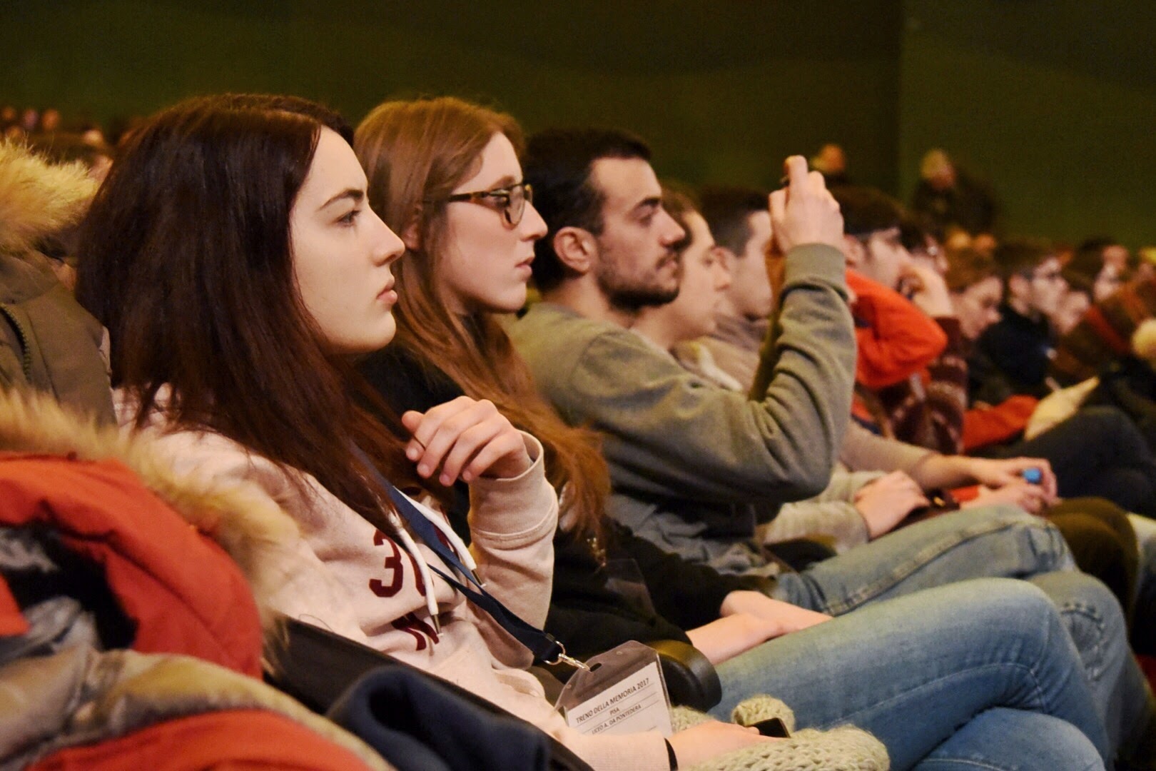Una volta sistemati in sala gli studenti toscani hanno ascoltato in video, dalla voce di Shlomo Venezia, unico italiano sopravvissuto al Sonderkommand, l’inferno delle camere a gas, la sofferenza e la tortura di chi veniva chiamato "a farsi una doccia" per non vedere mai più la luce del sole. Subito dopo 14 ragazzi hanno interrogato con domande puntuali, preparate il giorno precedente insieme ai compagni e ai professori, i testimoni presenti sul palco, Andra e Tatiana Bucci, Marcello Martini, Gilberto Salmoni e Vera Michelin Salomon.