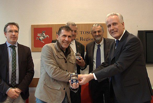 In occasione della presentazione dell’edizione della maturità, l’assessore regionale Vincenzo Ceccarelli ha reso omaggio agli organizzatori regalando loro una medaglia simbolo dei mondiali di ciclismo di Toscana.