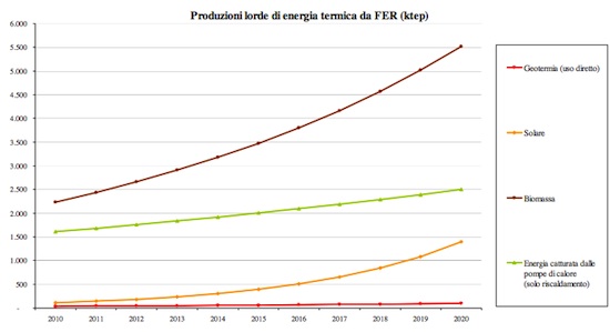 Riguardo alle seconde, sono necessarie misure addizionali per promuovere l’ utilizzo diffuso delle fonti rinnovabili a copertura dei fabbisogni di calore, in particolare nel settore degli edifici, che peraltro possono essere funzionali anche al miglioramento dell’efficienza energetica. Il balzo in avanti sarà notevole, se consideriamo che si passa, dalla modesta quota del 2,80 % da rinnovabile nel 2005 per la produzione di energia termica, al 15,83% nel 2020. La parte maggiore dovrebbe essere assorbita dalle biomasse (9,18% sul totale), seguite dall’energia prodotta da pompe di calore (4,16%). Tra queste quelle aerotermiche dovrebbero fornire il maggior apporto: 3,12% sul totale dell’energia impiegata. Al solare è assegnato un ruolo di appena il 2,33% a livello nazionale.