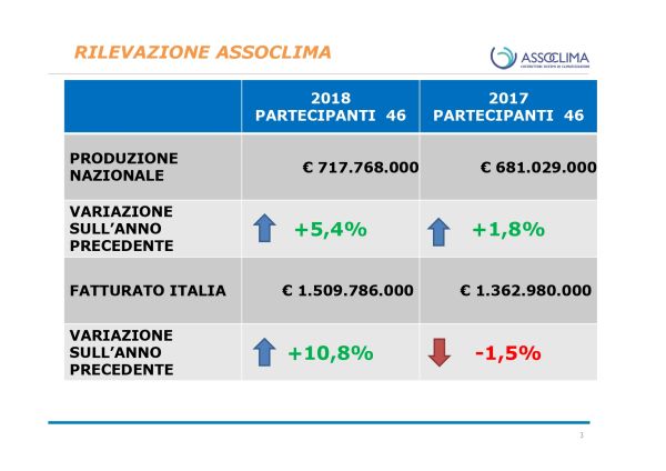 Presentati i dati di mercato 2018 di Assoclima: rinnovabili termiche e sistemi a pompa di calore in aumento. Monitorate 46 aziende del settore con un valore di mercato superiore al miliardo e mezzo di euro: +10,8% sull’anno precedente. Battuta d’arresto per i gruppi frigoriferi con condensazione ad acqua: -3% per valore e -7% per quantità